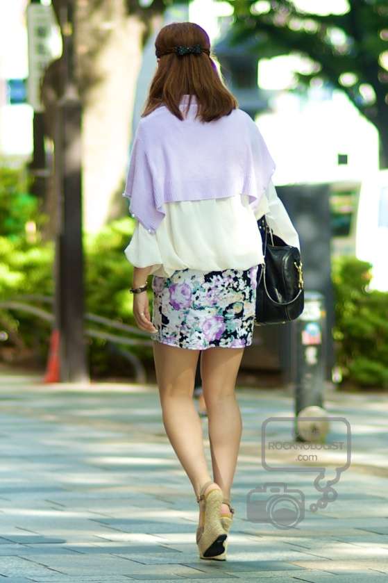 simple white blouse worn over the floral print short skirt, accented by her lavender colored sweater, black shoulder bag and beige wedge sandals…